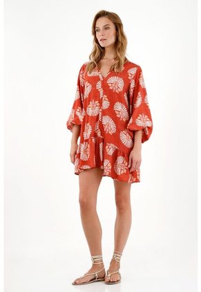 ¡Libre, bonita y muy al estilo TNS! Los estampados que más te gustan llegaron nuevamente en esta colección para darte los looks más llamativos de todos. Características- Color: naranja - Estampado - Corto - Silueta amplia - Manga larga - Puños con elástico - Escote en V - Bolero en ruedo - Material: Viscosa 100% Sobre el fit Disfruta de un tela suave, cómoda y súper fresca, mientras te robas las miradas de todos a tu alrededor.