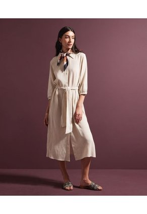 Vestido Camisero Manga larga, Largo Con Cuello Camisero Con Pechera Y Botonadura Nácar Visible, Con Cinturón De Amarre En Cintura Y Aberturas Laterales En Ruedo, Puedes Usarlo Cerrado Como Vestido O Abierto Como Un Sobretodo, Ideal Para Un Look Fresco Y Sofisticado.VestidoPara MujerModelo: Manga LargaColor: BeigeComposición: Viscosa 70%-Lino 30%Instrucciones de Lavado:No dejar en remojoLavar en agua fría separadamenteNo usar blanqueadorNo retorcerSecar a la sombraPlancha tibia