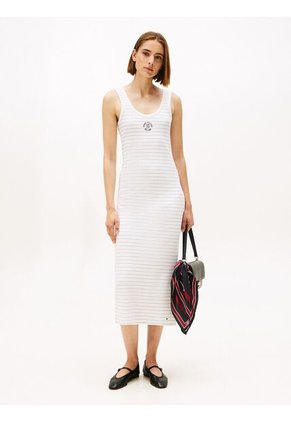 Este vestido de canalé combina comodidad y estilo en un diseño versátil. Su tejido suave y elástico se adapta al cuerpo, ofreciendo un ajuste favorecedor y libertad de movimiento, ideal para el uso diario o para ocasiones casuales con un toque moderno.Características• Confeccionado en algodón regenerativo y elastano• Tejido suave y elástico• Cuello redondo• Diseño de canalé con tirantes finos• Detalles distintivos de Tommy Hilfiger• Logo de Tommy Hilfiger bordado en el pecho• Bandera de Tommy Hilfiger en la parte inferiorTalle y corte• Vestido• Corte slimComposición y cuidados• 95% Algodón regenerativo, 5% ElastanoModelo: WW0WW466130FM