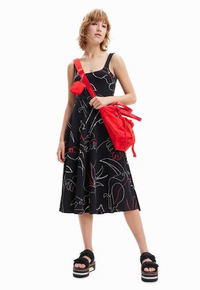 Vestido Negro-Beige-Rojo DesigualEncuentra tu propio camino en el mundo de la moda y expresa tu esencia con Desigual. Por ejemplo, con este vestido midi de tirantes en punto elástico y falda evasé, y estampado tropical arty. Al comprar productos de algodón de Desigual, estás apoyando nuestra inversión en Better Cotton. Especificaciones:• Fit: Regular Fit: Es recto, de los más cómodos, amplio y no va ceñido al cuerpo.