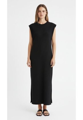 Vestido midi para mujer en color negro, elaborado en tela rib que aporta comodidad y ajuste. Con manga sisa, aberturas laterales inferiores y sesgo ancho en las sisas para un acabado limpio y moderno. Una prenda elegante y versátil ideal para looks casuales con un toque refinado.