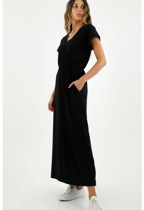 ¡Un vestido para robarte todas las miradas! Combina belleza, elegancia y estilo con una prenda que te hará lucir fantástica cada fin de semana. Características- Color: negro - Largo - Tejido de punto - Cuello en V - Manga corta - Cintura con elástico - Corte en frente - Bolsillos al costado - Material: Algodón 100% Sobre el fit- Esta silueta te hará resaltar toda tu feminidad, brindándote la frescura y libertad que tanto te encanta.