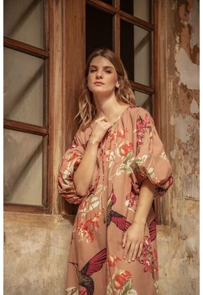 Te sentirás más femenina que nunca con este caftán estampado que gracias a su diseño con cuello henley y mangas perfectamente englobadas irradia un espíritu veraniego, pero a la vez súper sofisticado. ¡Úsalo a tu manera!- Vestido tipo túnica de mujer. - Silueta amplia. - Diseño con cuello henley, manga corta. - Tirantes delgados para anudar en el cuello. - Mangas englobadas con doble forro interno que aporta volumen a la silueta. - Bajo con aberturas laterales. - Combinación de colibríes y motivos florales estampados full cobertura. Información sobre talla: Lilian mide 1,79 y usa un vestido talla M.