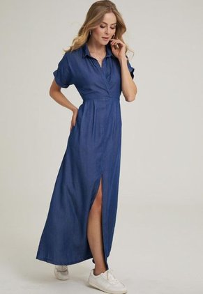 Vestido largo en demin 100% tencel, tono oscuro, cuello y escote en v cruzado, manga rodada con guardapolvo, corte imperio, detalle de elástico y abertura en cintura espalda. RAGGED es una empresa competitiva y sólida que cuenta con más de 30 años de experiencia con su propuesta de diseño y moda, comprometida con su misión de vestir a la mujer en sus diferentes estilos de vida resaltando su esencia femenina. Su compromiso con la mujer, la clara definición de las líneas de vestuario y los productos que satisfacen los deseos de la mujer llevan a RAGGED a poner en sus puntos de venta colecciones renovadas semanalmente, logrando así una presencia altamente competitiva entre las marcas internacionales.