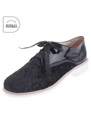 Elaborado en sintético terciopelo en capellada*Sintetico charol en cordonera, laterales y talón, cordón en textil de cinta, hilo al tono, forro textil, suela en TR con altura de 2.5 cm, producto nacional de excelente calidad y diseño.