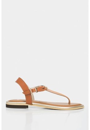 Zapatos tipo sandalia en sintetico para mujer, Diseño de sandalia plana tres puntada con contraste de colores en el material y herraje metalicos decorativos. Este diseño cuenta con una suela acolchada para mayor confort al caminar. Ideales para una ocasión de uso casual.